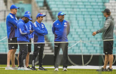 London: India’s head coach Gautam Gambhir and support staff interact with a groundsman during a training session ahead of the