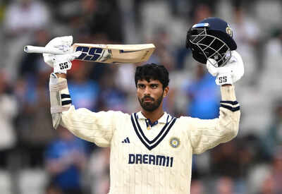 MANCHESTER, ENGLAND – JULY 27: India batsman Washington Sundar celebrates his century during day five of the 4th Test Match