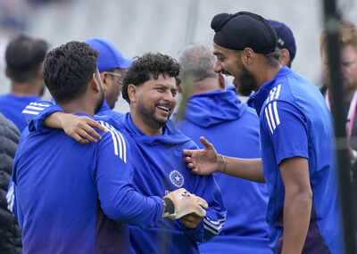Manchester: India’s Rishabh Pant, Kuldeep Yadav and Arshdeep Singh during a warm up session before the fourth test cricket match