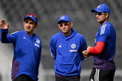 MANCHESTER, ENGLAND – JULY 21: India captain Shubman Gill speaks with coach Gautam Gambhir and selector Ajit Agarkar during a